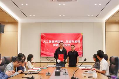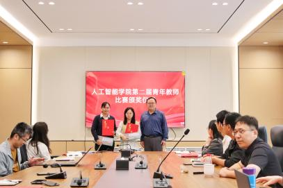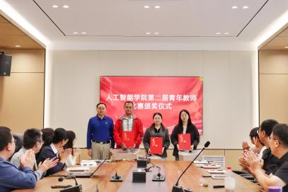 研讨会第二阶段举行人工智能学院第二届青年教师比赛颁奖仪式。副院长王鲁首先总结了本次青年教师教学比赛的整体情况,对参赛教师在教学设计、课堂呈现等方面的亮眼表现给予肯定。随后,他宣读获奖名单,共评选出一等奖1名、二等奖2名、三等奖3名,田大东教授和学院领导分别为获奖教师颁发荣誉证书,并鼓励全体教师以获奖教师为榜样,深耕教学领域,持续提升教学水平。