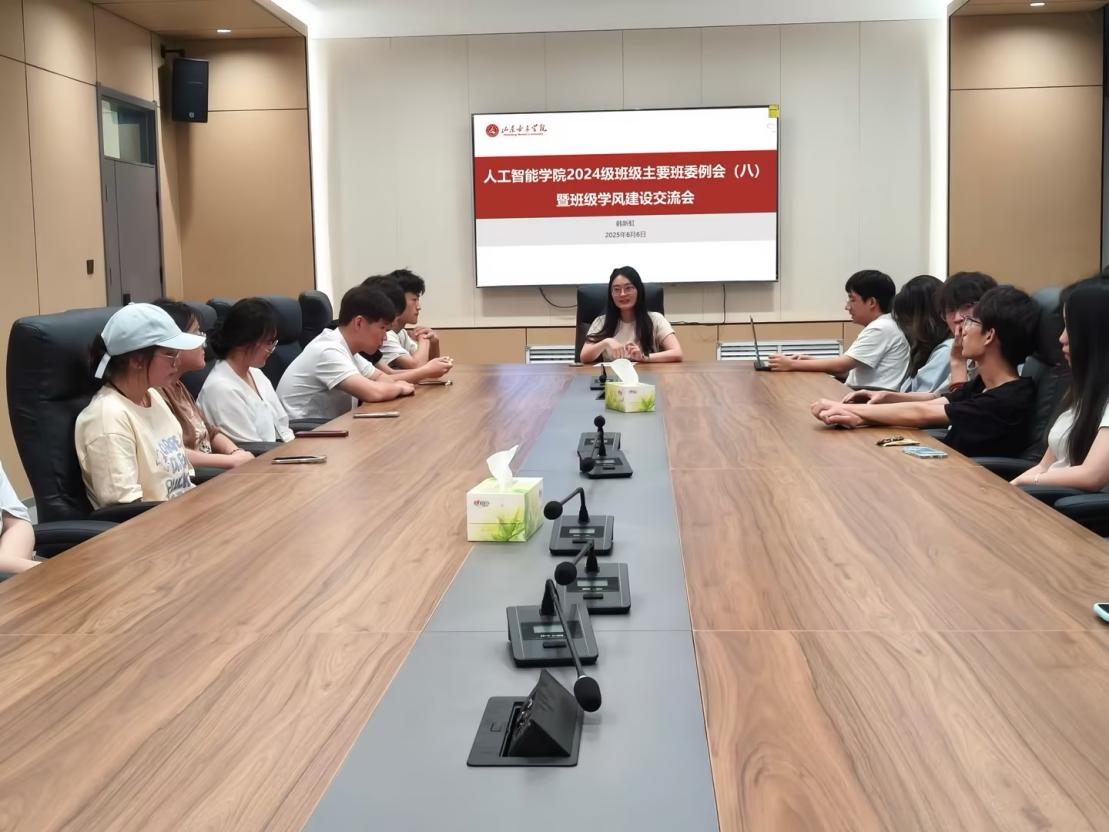 为进一步加强班级管理,营造良好学习氛围,人工智能学院于6月6日晚于求新楼414召开 2024 级班级主要班委例会暨班级学风建设交流会。本次会议由韩新虹老师主讲,2024级各班班长、副班长、团支书、学习委员共同参与。