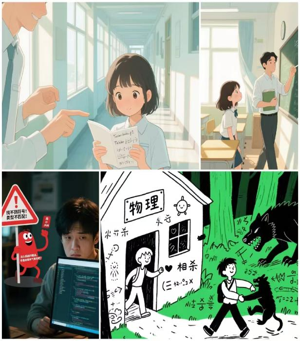 趣味环节里,大家把棘手科目拟人化,从初见印象、相处过程到通过努力实现 “亦师亦友” 转变,编写成独特小故事,再利用AI生成漫画或个性化风格图片。活动末尾,每人领取便利贴,写下对 “专属科目” 的鼓励话语,约定贴在课本首页,让文字化作学习之路的勇气注脚。