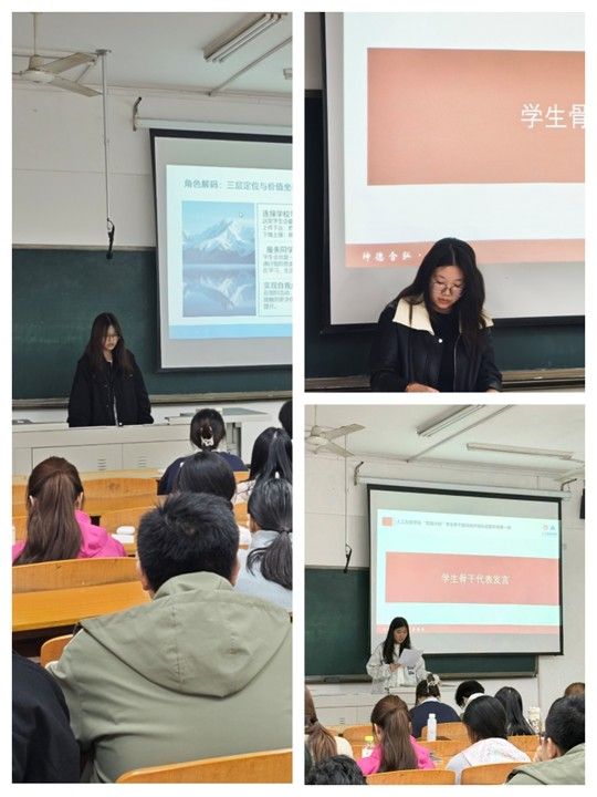 会议开始,2024级学生骨干为“青苗”学员们带来生动一课。综合部部长韩孜雯强调统筹与表达能力,指出学生骨干需具备全局视野,并建议新成员在任务中主动规划、积极沟通,实现从执行者到组织者的转变。学习部部长崔佳慧分享"严谨与创新并重"的工作理念,既要通过标准化流程确保公平公正,又要根据同学需求创新活动形式,让基础服务焕发新活力。生活部部长闫如梦从生活部工作细节出发,强调服务中的人文关怀,认为学生工作不仅要有严谨的态度,更要体现温度,在帮助同学解决实际困难中实现价值。三位部长的经历凝聚成一股力量,展现了学生骨干在实践中成长、在奉献中坚定初心的精神风貌。