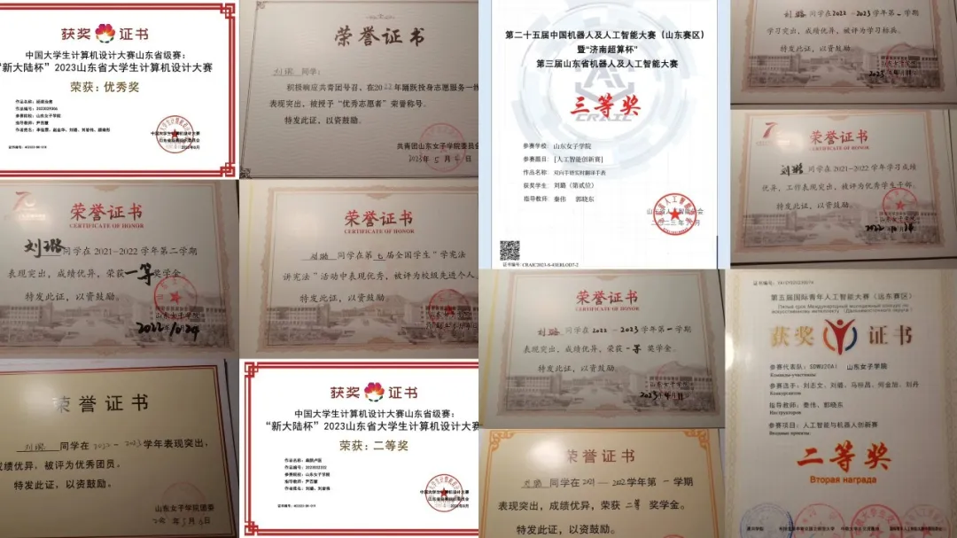 在校期间共获校级奖学金4次,国家级奖项1项,省级奖项4项,校院级奖项10余项”优秀学生干部”“优秀学生”“优秀团员”“优秀志愿者”她是第七届全国学生“学宪法 讲宪法”校级先进个人参加A类赛事“挑战杯”全国大学生创业计划大赛获校级二等奖;B类赛事中国大学生计算机设计大赛获得山东省二等奖和优秀奖,中国机器人及人工智能大赛山东省级二等奖;第五届国际青年人工智能大赛(远东赛区)二等奖。