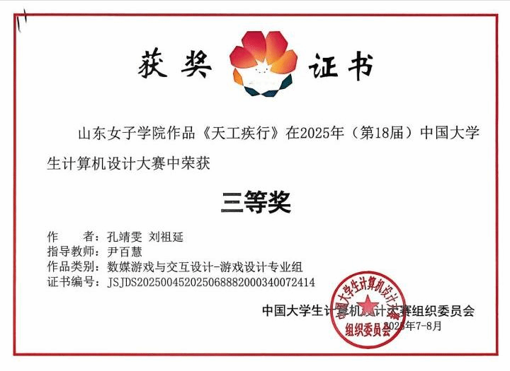 在刚刚结束的第18届中国大学生计算机设计大赛全国总决赛中,山东女子学院人工智能学院学子凭借出色的创新与实践能力,从全国3800余组参赛团队中脱颖而出,勇夺国家级三等奖!本次大赛由中国大学生计算机设计大赛组织委员会主办,南京大学、华东理工大学等多所知名高校联合承办。人工智能学院由尹百慧老师指导,房京臣老师带队,孔靖雯、刘祖延同学组成的《天工疾行》团队成功晋级上海赛区决赛,并荣获全国总决赛三等奖殊荣。