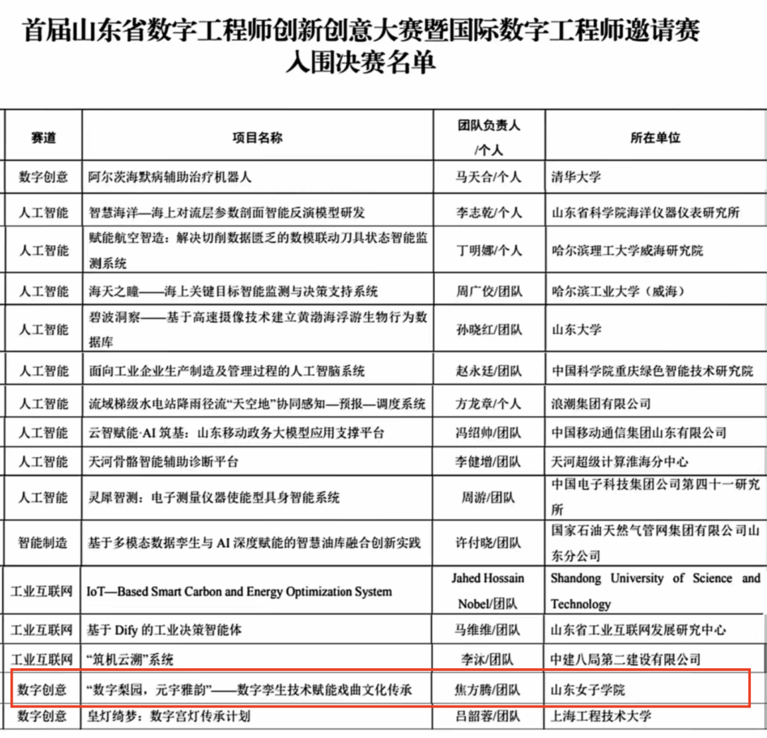 近日,由山东省人力资源和社会保障厅、青岛市人民政府联合主办的“智赋齐鲁 数领未来——首届山东省数字工程师创新创意大赛暨国际数字工程师邀请赛”在青岛圆满落幕。我校“智创魔方”团队凭借《数字梨园,元字雅韵——数字孪生技术赋能戏曲文化传承》项目,荣获数字创意赛道三等奖,展现了学校在数字技术与文化创意融合领域的扎实积累。